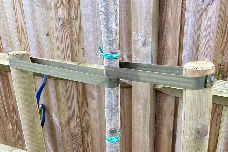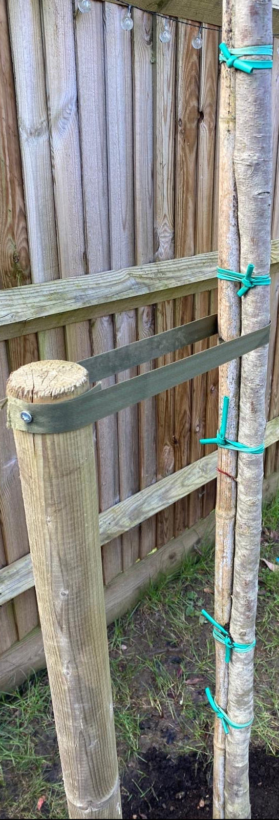 They should prevent the tree from leaning or flopping in the wind, but they must not cut into the bark or restrict growth. You should still be able to gently twist the trunk slightly — this small movement is beneficial for the tree’s development.